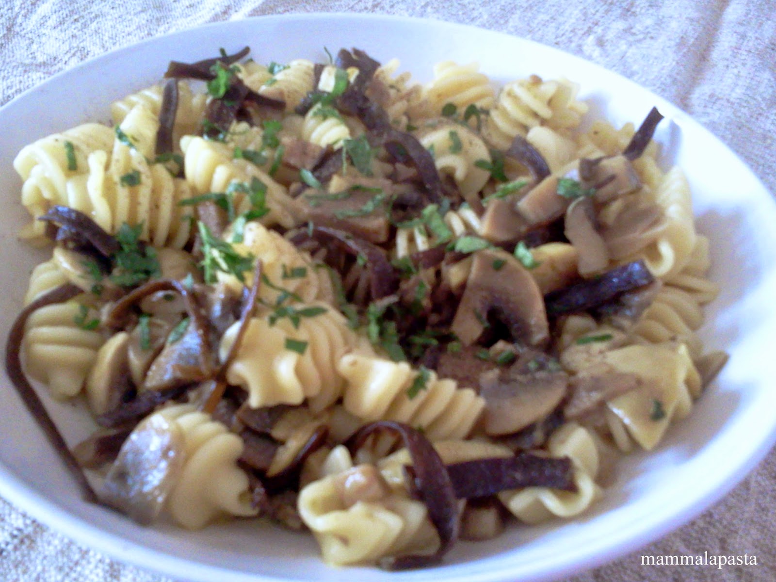 In timp ce fierb pastele, aproximativ 10-12 minute, pregatim sosul din restul ingredientelor. Incepem prin a aromatiza uleiul intr-o tigaie antiaderenta cu usturoiul taiat marunt si gingerul taiat marunt, cu cat mai marunt taiate, cu atat lasa mai bine aroma. Le tinem in uleiul incalzit la foc mediu circa 2 minute, amestecand cu atentie sa nu se arda si regland flacara in functie de acest criteriu, uleiul cald trebuie sa le „atace” dar fara sa le schimbe culoarea, trebuie, practic, sa sfaraie usor. Trecute cele 2 minute, adaugam ciupercile taiate de dimensiuni medii, cam ca la ciulama sau putin mai mari. Calim totul impreuna mentinand focul mediu spre mare inca vreo 3-4 minute, dupa care adaugam algele inmuiate si stingem totul cu sosul de soia de la alge, la foc iute. Odata evaporat revenim la flacara medie si le mai calim pe toate impreuna alte 3 minute. In final potrivim eventual de sare – atentie, teoretic nu e nevoie pentru ca am folosit sos de soia, care contine deja sare cat pentru o portie de mancare, plus faptul ca pastele au fost deja fierte in apa cu sare, ceea ce esential pentru gustul final. Neaparat, pentru a rotunji si completa aroma, completam cu piper si curcuma, cam un varf de lingurita din fiecare, in functie de gustul personal.