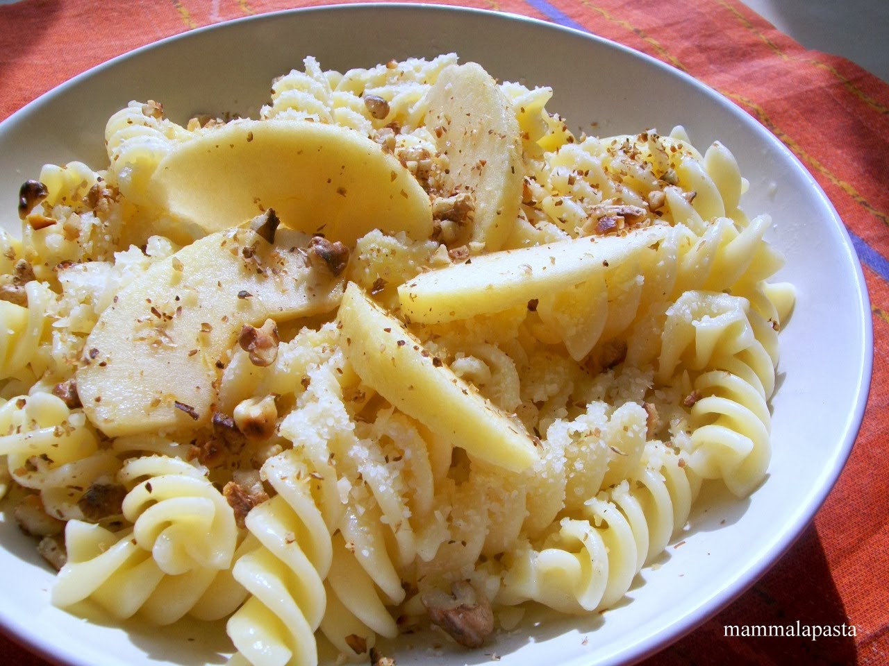 Cu granulele de nuca obtinute ce facem? Le presaram in farfurie, peste paste. Scortisoara intregeste aroma merelor, piperul accentueaza gustul usor picant al branzei gorgonzola, iar nucile prajite completeaza intregul, impreuna cu o lingura de parmezan ras. Echilibrul intre toate aromele e perfect.