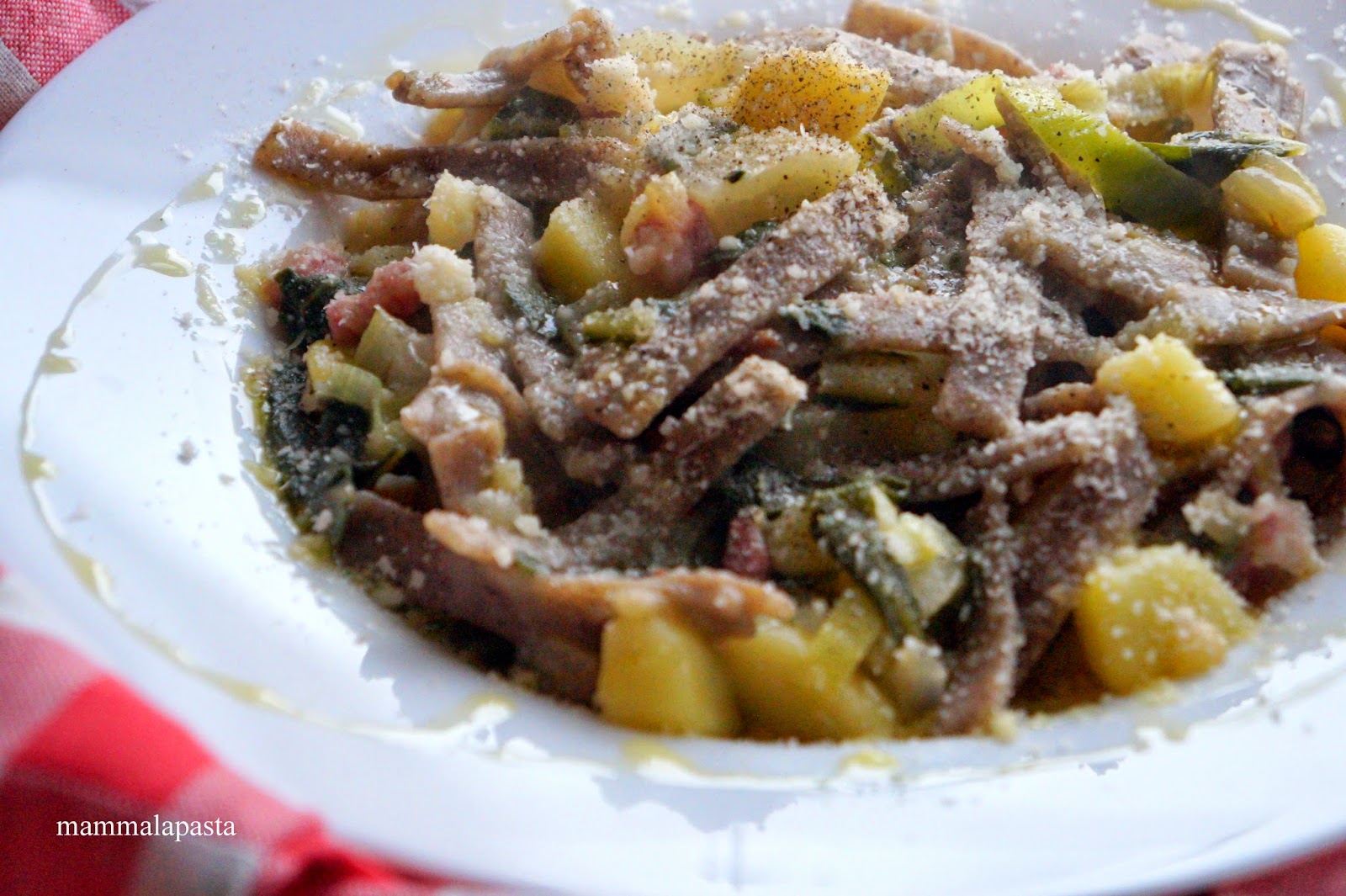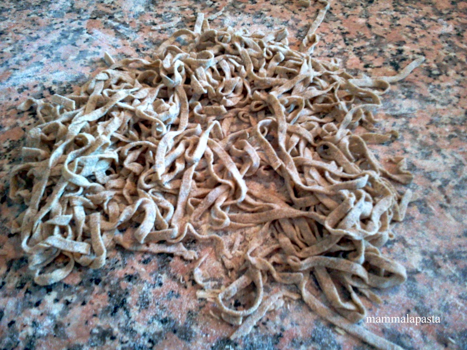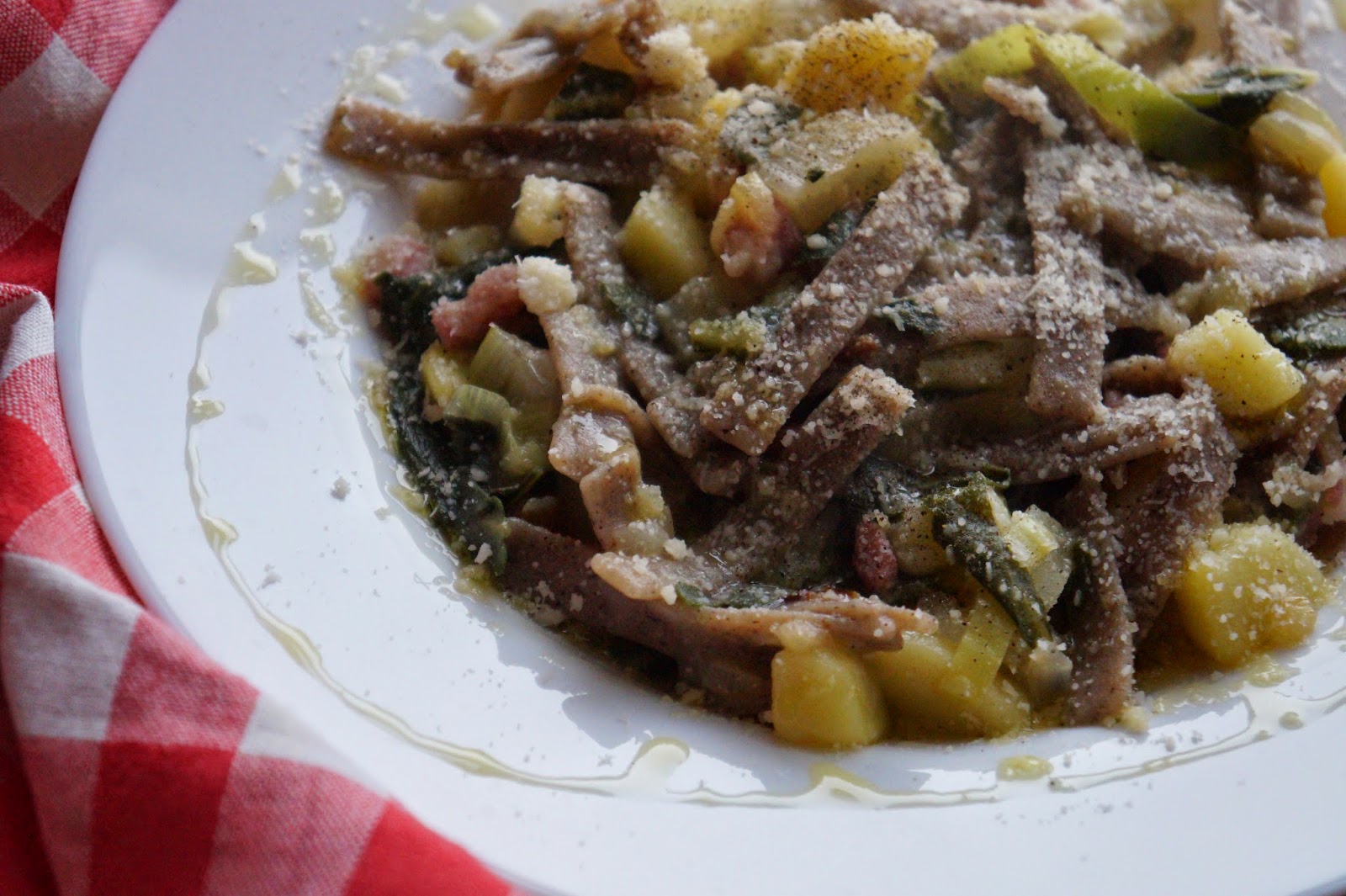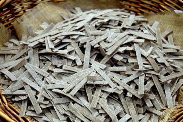 Reteta de azi, in traducere libera, inseamna asa: un fel de tagliattele, mai scurte decat cele obisnuite, care au in compozitie faina de hrisca, in italiana grano saraceno. Este tot o pseudocereala, la fel ca si quinoa sau amarantul, fiind inclusa din ratiuni comerciale in categoria cerealelor. Sint convinsa ca cine e curios sa citeasca pana la capat pe blogul meu despre aceasta reteta, o face inclusiv pentru ca stie deja multe despre proprietatile nutritionale ale acestei plante, hrisca, foarte bogata in proteine vegetale de calitate, multe vitamine si fibre si mai saraca in amidon. Nenumarate sint sursele de informatii despre hrisca, un aliment de baza in bucataria ruseasca si est-europeana. Ceea ce se stie mai putin e ca si bucataria italiana, in diverse regiuni, o foloseste in multe combinatii de dulce sau sarat, de la aperitiv la desert.