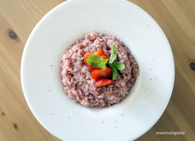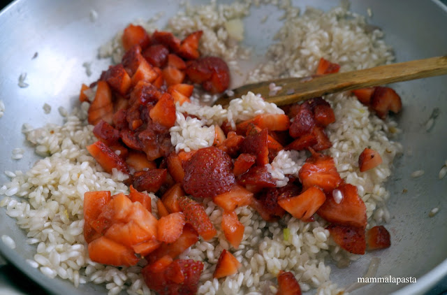 Risotto alle fragole. Se prepara cat ai zice capsuni si este egal cu aroma, parfum, textura fina si in general mancare rafinata, cu care puteti oricand suprinde. Dietetica si echilibrata, nu mai spun. Este unul din felurile de risotto mai putin obisnuite in Italia, si tocmai de-asta, poate, nu da gres niciodata. Ca la orice risotto, gatitul dureaza circa 20 minute si practic in jumatate de ora va puteti aseza la masa. Asta daca aveti pregatita dinainte supa de legume, indispensabila la orice risotto. Evident, puteti folosi cuburi vegetale din comert si prepara instant supa, insa atentie, cumparati bio, cand e vorba de amestecuri greu descifrabile, cum e cazul cuburilor. Eu o sa prefer intotdeauna sa fac din legume. Aveti procedeul aici si daca faceti mai mult puteti congela. Cine se misca natural in bucatarie stie toate astea, rabdare, voi, au si novicii dreptul sa invete.