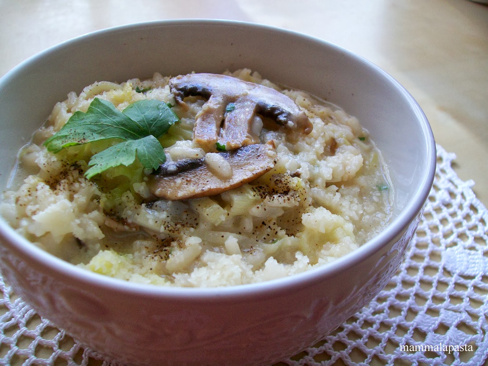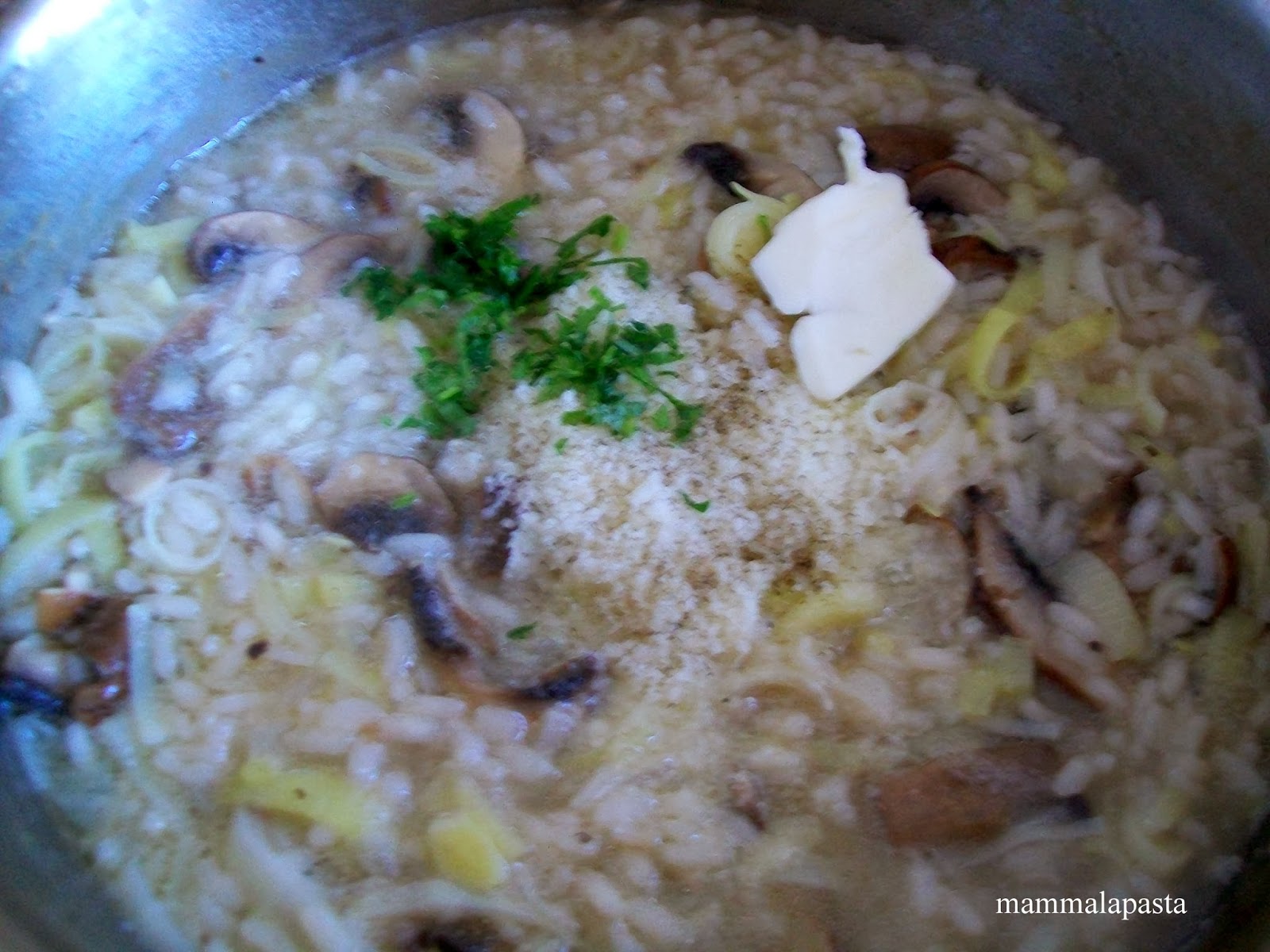 Le amestecam pana se calesc putin si ciupercile si prazul, apoi la foc mediu spre mic incepem sa adaugam putin cate putin din supa de legume, care va fi absorbita de orez incet incet. Totodata, adaugam si circa jumatate de lingurita de sare. Supa trebuie adaugata cand cea dinainte a fost absorbita, cate un polonic o data. E gata dupa aproximativ 18 minute, cand orezul s-a inmuiat, nu mai prezinta pete mici de amidon, dar nu e umblat, adica al dente. Stingem focul si adaugam untul si parmezanul ras, optional si putin patrunjel tocat si sare: