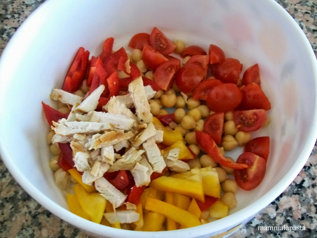 Odata rezolvata problema naut/ paste, restul dureaza foarte putin. Intr-o prima faza, incingeti o tigaie grill si pregatiti carnea de pui, pe care o coaceti intreaga, presarata doar cu putina sare, si o taiati dupa ce se raceste putin.