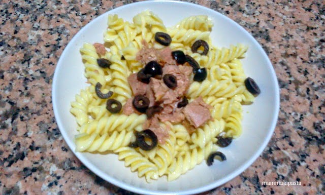 Peste ele, adaugati tonul din conserva maruntit bine si maslinele negre taiate felii subtiri, amestecand din nou, evident cu atentie, ca sa nu rupem pastele: